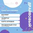 Пакет на 6 чел. В программу входит: боулинг (60 мин.) • лазертаг (30 мин.) • карта игровая (номинал 50 BYN) • праздничный стол (сеты на выбор)