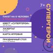 Пакет на 6 чел. В программу входит: квест «Супергерой» (35–45 мин.) • лазертаг (15 мин.) • карта игровая (номинал 50 BYN) • праздничный стол (сеты на выбор)